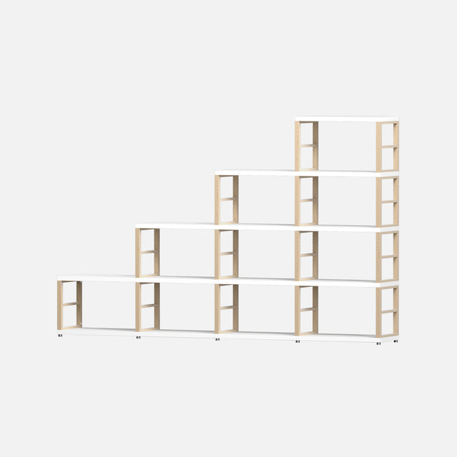Supplied as flat-packed panels, this European-made Boon MAXX 4 Step requires assembly. It measures 1470 mm high, 2310 mm wide, and 330 mm deep. The structure features 14 solid oak frames—5 MAXX XL and 9 MAXX L—each 27mm thick, combined with white laminated panels. This robust, high-quality storage cube is perfect for bedrooms, wardrobes, vinyl records, books, wine bottles, office files, or retail displays. Each cube’s internal dimensions are 54 cm wide, 33 cm high, and 33 cm deep. All necessary fixings are included. The system is expandable with additional panels, frames, and accessories like soft boxes and door kits.
