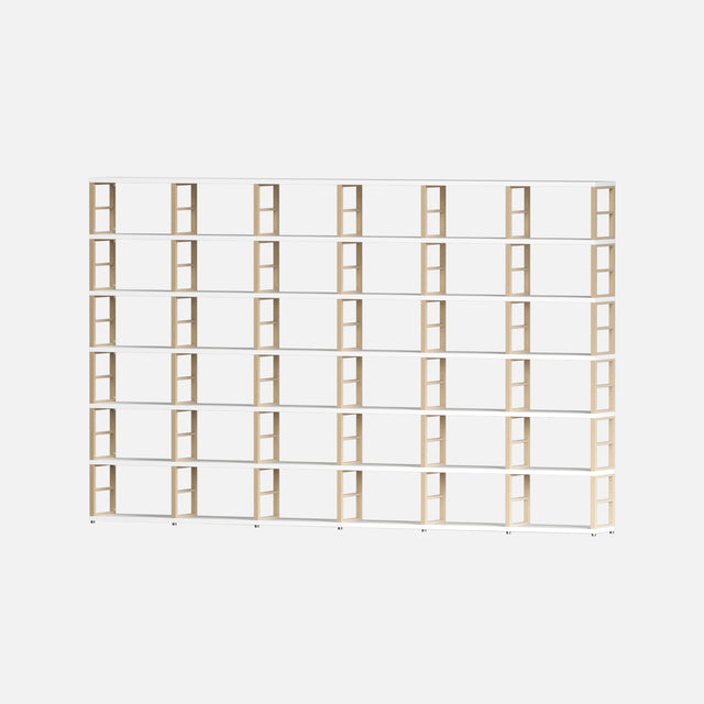 The European-made Boon MAXX 6x6 arrives as flat-packed panels requiring assembly. Measuring 2180 mm high, 3450 mm wide, and 330 mm deep, it features 42 oak wood frames combined with 27mm thick white laminated panels to form a sturdy 36-cube floor storage system. Designed for durability and versatility, it suits bedroom and wardrobe storage, vinyl records, books, wine bottles, office files, room dividers, and retail displays. Each cube measures 54 cm wide by 33 cm deep and high. Assembly is straightforward with all fixings, screws, and adjustable feet included. Expandability is possible by adding XL or L panels, frames, corner panels, and accessories.