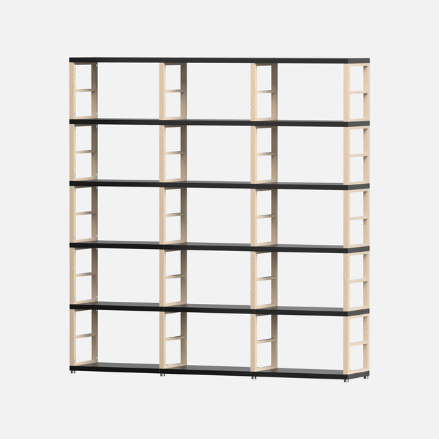 Supplied as flat packed panels, requires assembly. Overall outside dimensions 1830 mm high x 1740 mm wide x 330mm deep 20 x F solid Oak wood European made frames , 6 maxx XL, 12 maxx L 27mm thickness European made black laminated panels combine to make the 3x5 maxx Boon floor cube kit, each cube with inside dimensions of 54x33x33cm. High quality, rigid, heavy duty storage cube shelf, ideal as a room divider, for, bedroom storage, wardrobe storage, vinyl records, books, wine bottles and ideal for promotion of instore retail products. All fixings and screws required are supplied for easy assembly. Boon maxx kits can be added to as required by purchasing more maxx XL, maxx L sized panels, frames, fixing kits, and feet kits as needed. Boon wide coloured soft boxes, 90 degree corners, all are available.