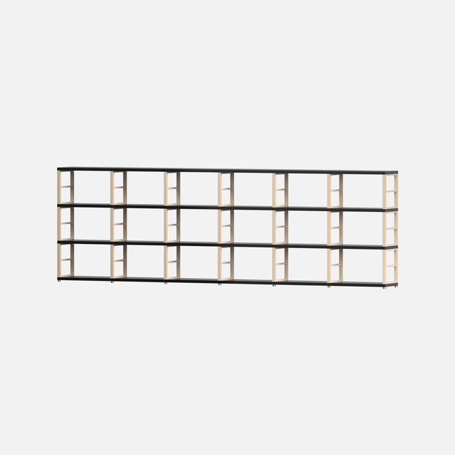 This European-made Boon MAXX Black and Oak 6x3 storage unit arrives as flat-packed panels requiring assembly. Measuring 1120 mm high, 3450 mm wide, and 330 mm deep, it features 21 solid oak frames and 27mm thick European panels forming 18 cubes, each with internal dimensions of 54x33x33 cm. Designed for durability and versatility, it suits bedside storage, wardrobes, vinyl records, books, wine bottles, retail displays, and merchandising. All necessary fixings are included for straightforward assembly. Expandable with additional panels, frames, and accessories, this system adapts to evolving storage needs.