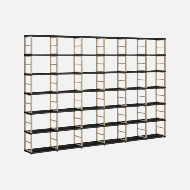 Delivered as flat-packed panels, this European-made Boon MAXX Black and Oak 6x6 requires assembly. It measures 2180 mm high, 3450 mm wide, and 330 mm deep. The structure features 42 solid oak frames from Europe, combined with 7 Maxx XL and 35 Maxx L black laminated panels, each 27mm thick, forming a robust 36-cube floor storage system. Designed for durability and versatility, it suits bedroom and wardrobe storage, vinyl records, wine bottles, office files, room division, and general display. All necessary fixings and screws are included. Expandable options include additional panels, frames, corner pieces, fixing kits, feet, and coloured soft boxes.