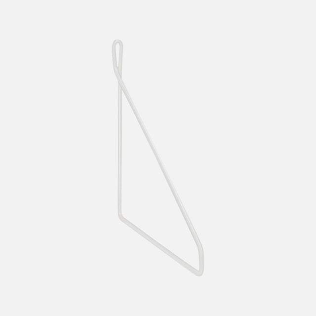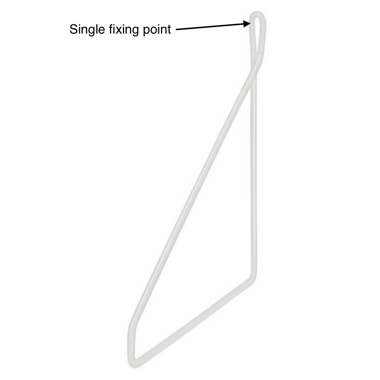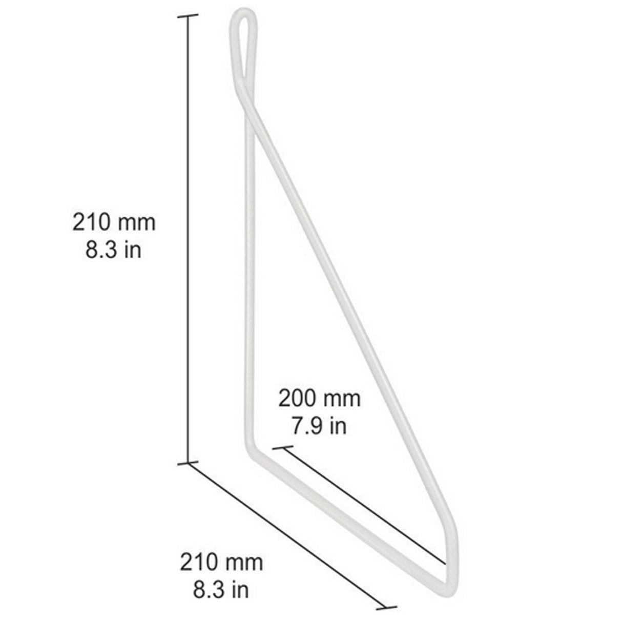 A pair of the latest style triangular 210x210mm wire brackets finished in white powdercoat with a weight capacity up to 15kg per pair. Fit the brackets with the single fixing point to a brick wall or to a cavity wall, ideally fitting the brackets to the wooden studs if the studs line up with where your shelf is to be positioned. Fit shelves of 200mm depth, a maximum thickness of 24mm and any length using these wire brackets fitting brackets at maximum centres (spacing) of 80cm for the best weight capacity. (use extra brackets for fitting longer shelves). Alternatively if fitting onto gyprock sheet fit the brackets using quality hollow wall anchors here. Use 1 per bracket. Weight capacity up to 10kg per pair when fitting a 600x200 sized shelf such as the solid plywood shelves or the new vintage white European made shelf here .