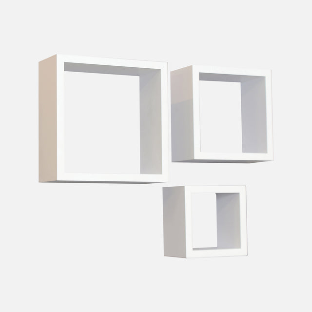 The set consists of 3 MDF White lacquered kubes. All are attached to the wall using the discreet fixing keyhole slot brackets built into the rear face of the cubes, giving the "floating" effect, with the screws and wall plugs supplied for solid brick type walls. Each kit contains one of each Kube, sizes are .. 25x25cm 20x20cm 15x15cm All the kubes are 10cm deep, the wall thickness of the cubes is 15mm (1.5cm). High quality fixings for mounting to hollow cavity type walls available on this site here. 2 are required per Kube.