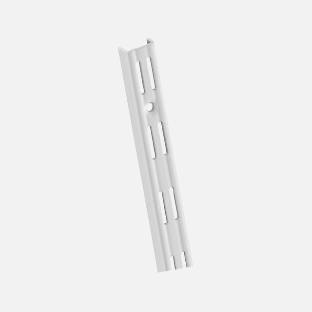 Highest quality best value heavy duty white finish 50mm pitch double slot wall strip. Fit the white single slot 50mm pitch together with these 50mm pitch double slot wall strips and fit white or black steel shelves. Brackets and wall strips are very hard wearing and are rust resistant due to the powdercoated finish. Pitch is the measurement between the top of a slot in the wall upright to the top of the slot below. Fit these wall strips to masonry walls using the screws and plugs part number 209043 available on this website. Hollow wall anchors part HW3 can be used for fitting to the wall strips to gyprock sheet. Note the overall weight capacity would be reduced when fitting only to gyprock sheet. New black ventilated shelves or the latest black steel shelves can also be fitted using these double slot wall strips.