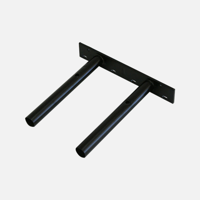 This bracket supports custom floating shelves 250-300 mm long and up to 250 mm deep, requiring shelves at least 40 mm thick to fit the 30 mm deep base. The steel base measures 185 x 30 mm with 2.5 mm thickness, and the support tubes are 18 mm wide and 175 mm long. It attaches to the wall with screws through seven predrilled holes, with extra holes possible for stud alignment. Shelves are fitted onto the tubes after drilling clearance holes and can be secured with screws, adhesive, or silicone. The slightly angled support tubes reduce shelf sagging. Proper installation on solid walls supports up to 25 kg evenly distributed; capacity is less on drywall or for deeper, longer shelves.