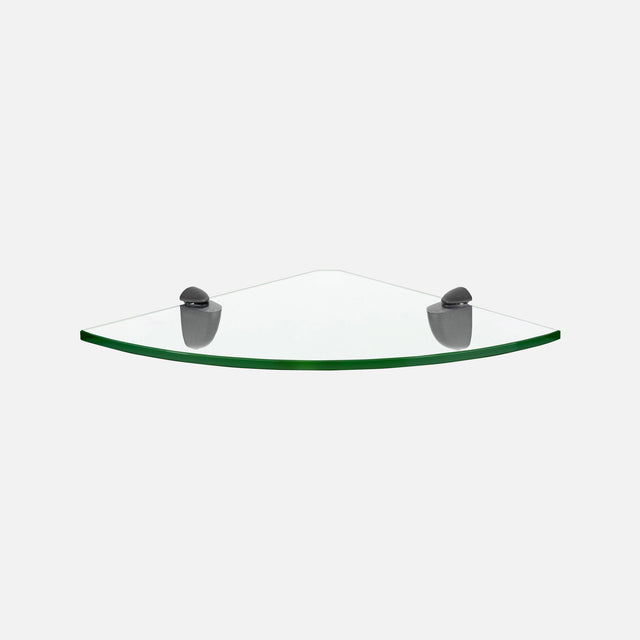 Exclusively available at Shelving Shop, this toughened safety glass corner shelf measures 250mm by 250mm with an 8mm thickness and comes with two clip brackets finished in anthracite black. It is expertly designed for installation in damp environments like shower corners, bathrooms, and laundries, while also offering practical display and storage solutions in corners of homes, offices, or retail settings.