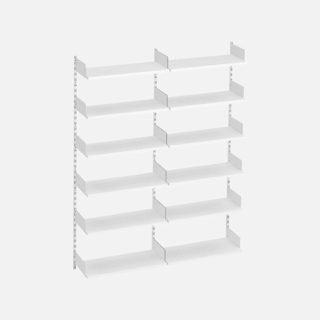 Overall dimensions are 1600mm wide x 320mm deep x 2000mm high. Select the hang rail top track 1640 long part 206110 for ease of installation and increased weight capacity. New to shelvingshop is a very high quality, high weight capacity 12 shelf kit, ideal for book or file storage in an office, home office or for any area where heavy duty adjustable shelving is required. The unique shelf support brackets double as bookends and have a weight capacity of 30kg per pair. European made shelves , the sizes are 788mm wide x 300mm deep and 25mm thickness, the 3 wall uprights are 1995mm in length. Shelves and the joined bookend brackets can be re positioned at any time to suit vertical spacing variation required for your book or file storage requirements. We recommend you select the top hang track rail here to simplify your installation and add extra weight capacity to the 12 shelf unit. The system can be added to at any time by adding extra shelves and brackets plus wall uprights to increase the storage capacity. Select wall fixing screw packs to suit your wall type, E.G. brick, masonry or gyprock plasterboard type.