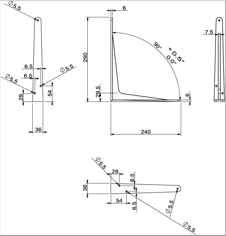New, die cast Aluminium Herakles strong shelf bracket in satin Black powdercoated finish, is 290mm x 240mm, with aesthetically pleasing minimalist lines and a very high weight capacity of up to 240Kg per pair when fitted correctly into good condition solid brick/cement type walls, or into a wooden stud in a cavity wall. By nature of the brackets unique design with the strengthening web, it does not need a triangle brace support which can obstruct products stored on the shelf level below when fitting multiple shelf levels. Please note as with all wall mounted brackets the Herakles bracket is only as strong as its fixing to the wall or the fixings used. Fit the popular 800x300x19mm Oak sand shelf (featured) with these Black Herakles strong brackets. The provided fixing holes in the bracket are 6mm in diameter. There are 6 different sizes of Herakles brackets exclusively available from shelvingshop.