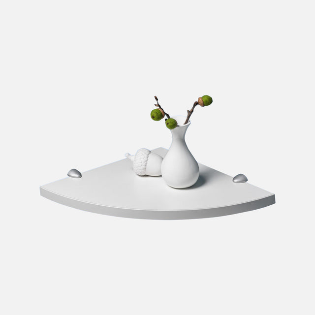 European made corner shelf, each flat side of the shelf (radius) is 300mm long x 19mm in thickness finished in white laminate plus a pair of quality mini clips in Stainless style finish.