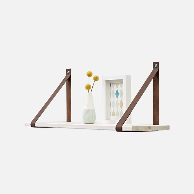 A pair of the latest style brown leather loop brackets with a weight capacity of up to 10kg combine with the lite vintage effect pine white distressed finish 600x200x18mm thickness shelf. Fit the loop brackets with the single screw fixing supplied to a brick/masonry wall or to a cavity wall, ideally fitting the brackets to the wooden studs if the studs line up with where your shelf is to be positioned. Slide the shelf into the loop brackets once the loops have been secured to the wall with the single screw fixing ensuring the shelf sits into the loops and hangs flat and level. If fitting the loops onto gyprock sheet fit the leather brackets using quality hollow wall anchors here . Use 1 fixing per loop bracket. Weight capacity would then be dependent on the strength of the wall sheet but expect up to 10kg when fitted correctly by an experienced shelving installer using the correct hollow wall fixings. The leather loop shelf kit is also available as a pair of loop brackets together with a 600x250 shelf, an 800x200 or an 800x250x18mm sized shelf.
