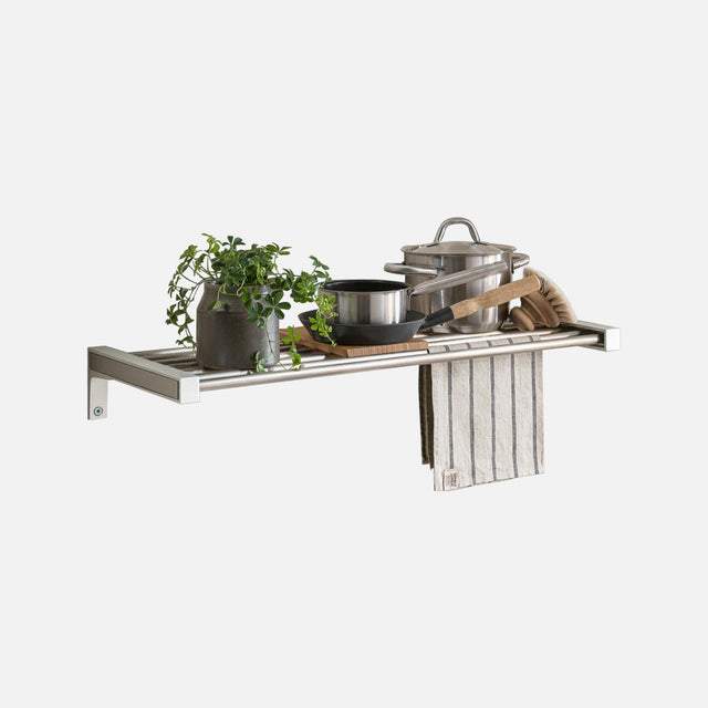 One high quality Stainless Steel tube shelf, size 800mm x 300mm deep. Fit with the two belt brackets supplied with the tube shelf. Shelves can be joined together within one belt bracket. Perfect for kitchens, laundries, or anywhere a ventilated shelf is required for storing towels etc. and is Ideal to hang coat hangers when airing or drying clothing in a laundry. The belt brackets are also available in Silver, stainless steel effect, or Matt Black. Screws and wall plugs are included for fitting to brick/masonry type walls. Use hollow wall anchors part number HW3 if fitting the belt brackets to cavity gyprock walls, 2 are required per bracket.