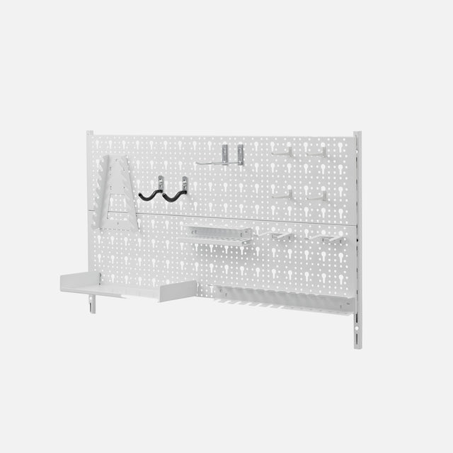 Wall mounted workshop Shelf kit. 18 parts included for hanging and storage of tools. The new pegboard kit allows you to store your tools conveniently and within easy reach in your workshop or garage. The workshop shelf kit can be arranged whichever way you like, and can be extended at any time as your tool collection grows. Create your very own custom tool shelf. The pegboard attaches to the 2 x 50mm pitch single slot wall strips supplied, or onto the 50mm pitch double slot adjustable wall stripping. Peg boards and all storage hooks and racks are available to purchase separately.