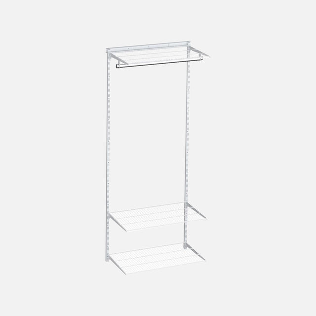 Overall outside dimensions 850mm wide x 440mm deep x 2000mm high New is the high quality 3 gridboard ventilated wire shelf and chrome hanging rail kit, ideal for wardrobe storage or for any area where adjustable wire ventilated shelving is required for clothes or general storage. Shelf sizes are 800 wide x 400mm deep and the 2 wall uprights are each 1995mm in length. Simple to fit with the wall uprights hooked onto the 840mm top hang track rail, allowing fine side to side adjustment to ensure ease and accurate fitting of the gridboard wire shelves into the provided brackets. 2 clothes rail hang brackets and one 840mm long chrome clothes rail plus end caps are also included which can be easily positioned to suit your requirements. Extra ventilated or the lightboard shelves and slide in brackets can be added at anytime to suit your changing storage requirements. Screws and wall plugs are available select them to suit the wall type you are fitting your shelving to, also hollow wall fixings if fitting the top track to gyprock sheeting. It is recommended to try to fit one or two of the hang track hole fixing points into wooden studs in a cavity wall if possible. Extra holes can be drilled in the hang track to suit stud positions in the cavity wall.