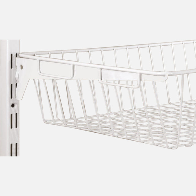 High quality wire ventilated basket, the dimensions are 800 x 400 x 120mm deep. Fit this basket shelf together with the 400mm long brackets sku code 201061WHT and onto the 50MM PITCH hang track twin slot wall uprights, either the 1195mm long or the longer 1995mm length. Hang tracks to support (hang) the wall uprights are available in 840mm, 1290 mm and 1690mm lengths. The 400mm long single slot bracket and ventilated baskets can also be installed using the 50MM PITCH single slot wall uprights see here .