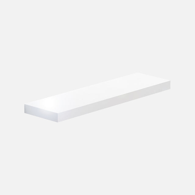 This 50mm thick floating shelf features a white high gloss finish and comes with all mounting hardware. When properly installed on solid brick or concrete, it supports up to 15kg evenly distributed. For drywall, use heavy-duty anchors, and for hollow stud walls, secure at least one hole into a stud with additional anchors as needed. Ensure the bracket base sits flush against the wall for safe, stable support.