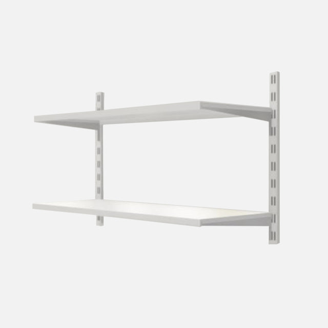 2 high quality heavy duty white powder coated 800×300 strong steel shelves. Fitted together with 4 x 300mm long white single slot brackets which lock tightly into the shelves and mount to the wall using 2 of the latest double slot 50mm pitch wall strips at 500mm long.