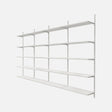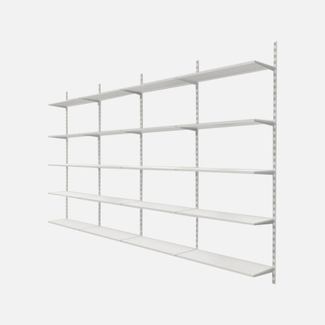 20 high quality heavy duty white powder coated 800x250mm deep strong steel shelves. Fitted together with 40 x 250mm long white single slot brackets which lock tightly into the shelves and mount to the wall using 5 of the latest double slot 50mm pitch wall strips 1995mm long. Wall screws not included select based on wall type. Use part 209043 for solid walls or use Hollow wall anchors part HW3 if fitting to gyprock sheet. Kit can be added to at any time by adding more brackets, steel shelves and wall strips.