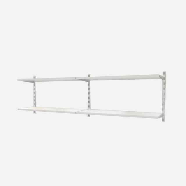 4 high quality heavy duty white powder coated 800×300 strong steel shelves. Fitted together with 8 x 300mm long white single slot brackets which lock tightly into the shelves and mount to the wall using 3 of the latest double slot 50mm pitch wall strips at 500mm long.
