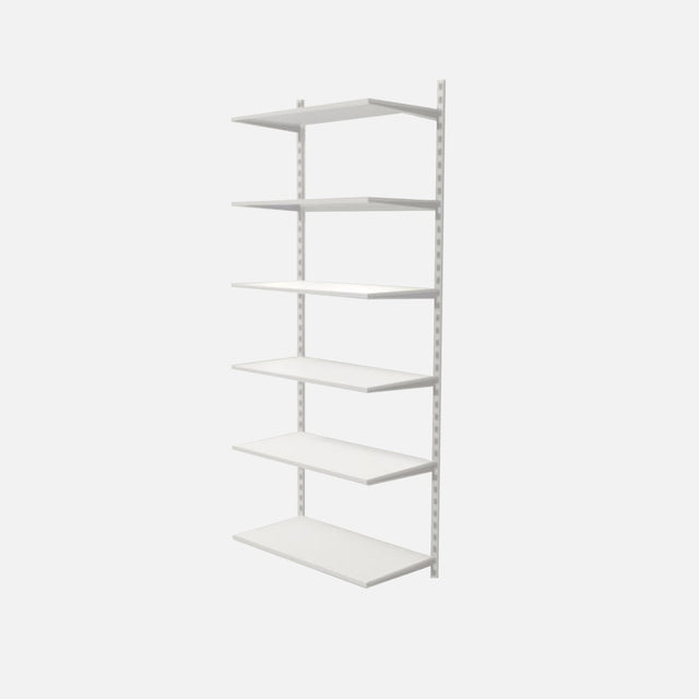 6 high quality heavy duty white powder coated 800×300 strong steel shelves. Fitted together with 12 x 300mm long white single slot brackets which lock tightly into the shelves and mount to the wall using 2 of the latest double slot 50mm pitch wall strips at 2000mm long.