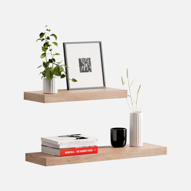 This is our Rustic Ash Real Wood Veneer Laminate Floating Shelf range, featuring the natural shade variations of genuine wood. The 50mm thickness provides robust strength on the wall and an enhanced aesthetic—ideal for both residential and commercial spaces.